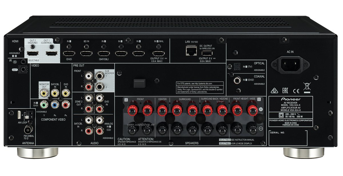 ● 7 kanalit, 150W võimsusega ● 2 lisakõlarite ühendust - B kõlaripaarile või Front High heliseade ülemistele kõlaritele ● 192 kHz/24-bit D/A konverter ● HD heliformaatide toetus - Dolby TrueHD, DTS-HD Master Audio ● Bi-Amping võimalus - võimalik madal- ja kesk/kõrgsagedused eraldi võimendada, ning saata esikõlaritesse eraldi kaablitega ● 2 aktiivsubwoofri ühendust ● Zone2 - Võimalik helindada ka teist tsooni (köök, magamistuba vms.) ja saata sinna põhikõlaritest erinevat helisignaali . Heli saab juhtida nii puldiga kui ka nutitelefonide kaudu (Pioneer Control App). ● Hi-bit 24 processing