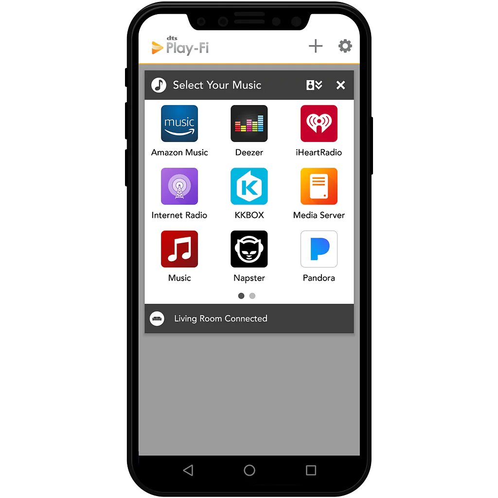 Nutiseadme rakenduse kaudu juhtimine üle WiFi DTS Play-Fi rakenduse kaudu juhtimine võimaldab WiFi kaudu ligipääsu muusika voogedastusteenustele ja helisisule, mistahes nutitelefonist või tahvelarvutist ning esitada seda kogu kodus.